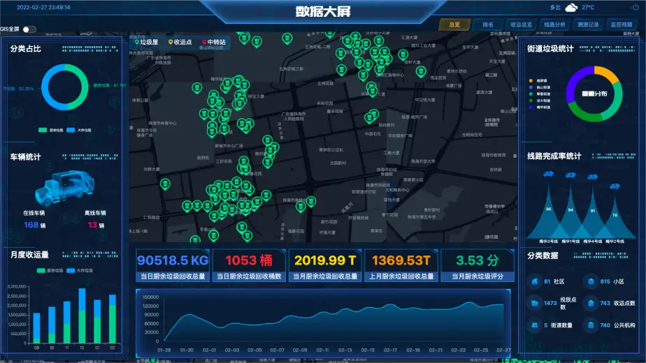 数据大屏实时展示区域分类占比、车辆运行轨迹、人员作业状态,支持按街道、社区生成分类效果排名与趋势分析。